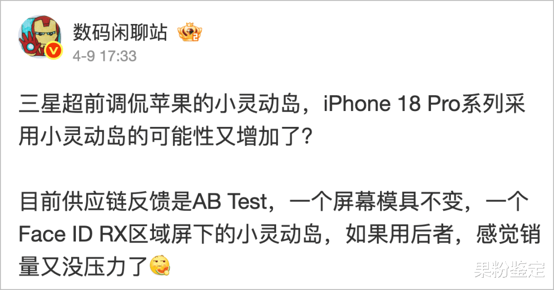 灵动岛已经这么多年了,咱天天盼着苹果把这个「屎上雕花」的设计干掉,结果等了一代又一代,它硬是成了 iPhone 的标志性设计。根据爆料,目前供应链还在双方案测试,不过目前用哪套方案还没定。