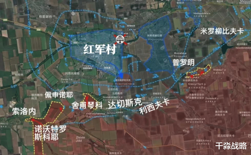 目前,乌克兰武装部队在红军村的局势极其困难,诺沃特罗斯科耶以北,宽1.7公里;诺沃奥列诺夫卡(Novoolenovka)北部,沿着一些森林带,面积高达2.2公里。