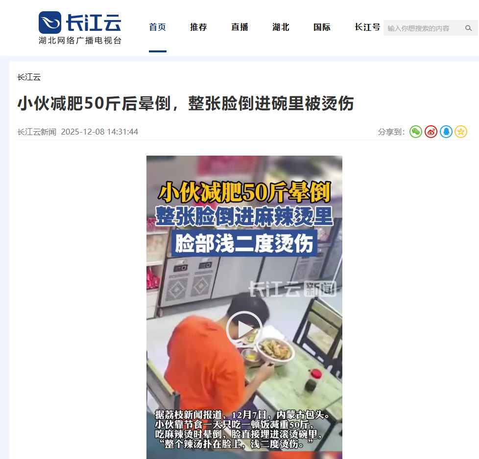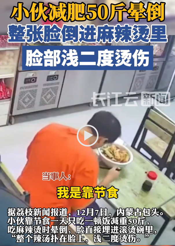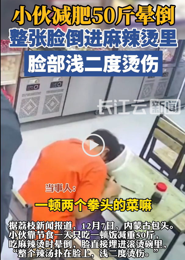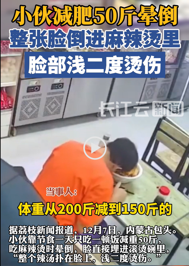 看到这新闻真是吓了一跳,小伙减肥50斤直接晕倒,脸扣进碗里烫伤,听着都疼。