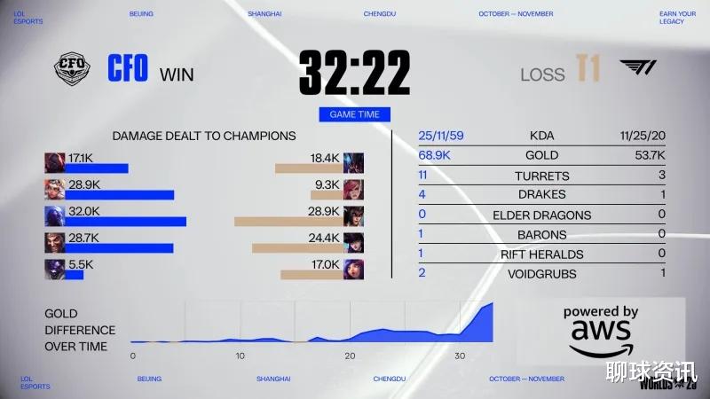 29 分钟:CFO 拿下第二条大龙,利用 Buff 推进高地,瑞兹闪现开团击杀蛇女和雷克塞,奇亚娜收割残局完成双杀,CFO 团灭 T1 并推平基地,以 32 分 22 秒结束比赛。