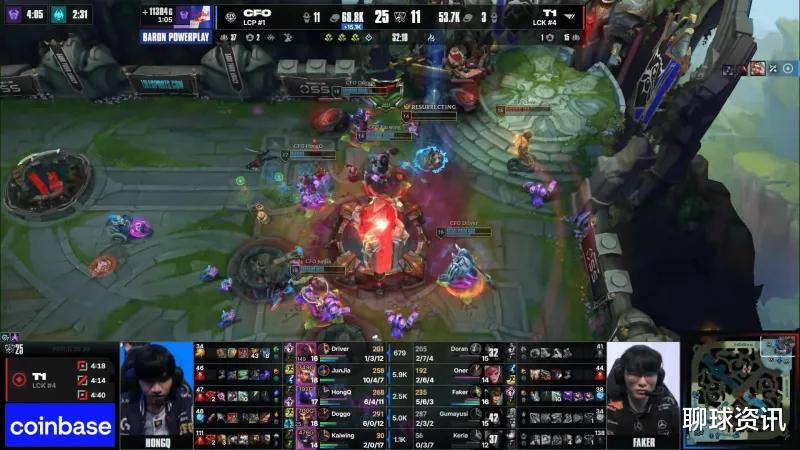 25 分钟:CFO 主动开大龙逼团,奇亚娜绕后秒杀雷克塞,瑞兹和德莱文跟进输出,T1 野辅(蔚、妮蔻)阵亡后被迫放弃大龙,经济差扩大至 8000 元。