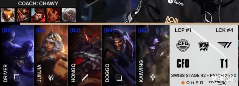 禁用英雄:巴德、皇子、猴子、岩雀、安蓓萨CFO 针对 T1 擅长的野区联动和开团体系,优先禁用了巴德(限制游走)、皇子(野区节奏点)和岩雀(地图掌控),同时封锁了 T1 中单 Faker 的招牌英雄安蓓萨(安妮),迫使 Faker 选择其他英雄。