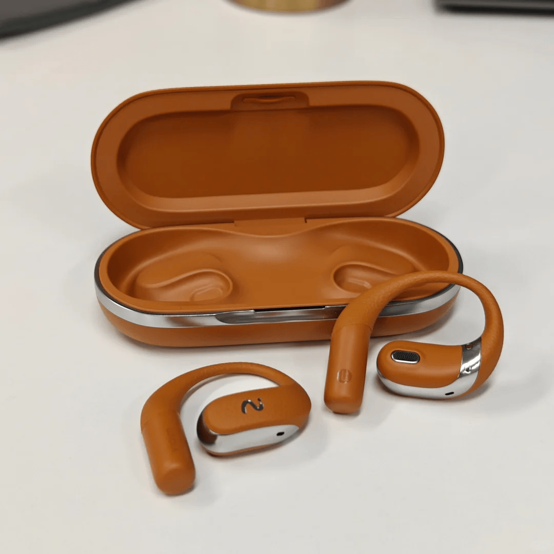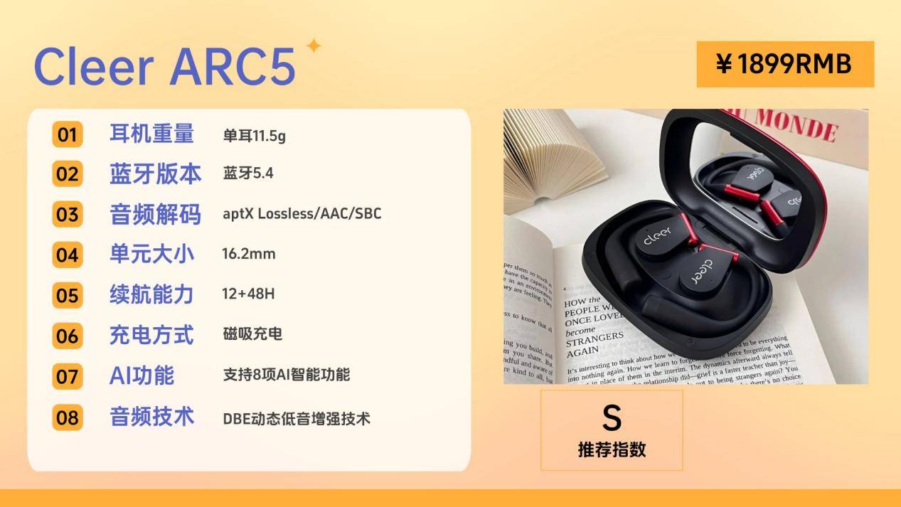 Cleer ARC5以AI智能功能作为核心卖点,整机配置极为丰富全面。该耳机采用耳挂式设计,耳挂选用医疗级硅胶材质打造,配合可伸缩与可旋转的双调节转轴设计,可根据不同用户的耳型灵活调节,大幅提升了佩戴的贴合度。单只耳机重量约为11.5克,在短时间佩戴场景下,能为用户提供舒适轻便的使用感受。