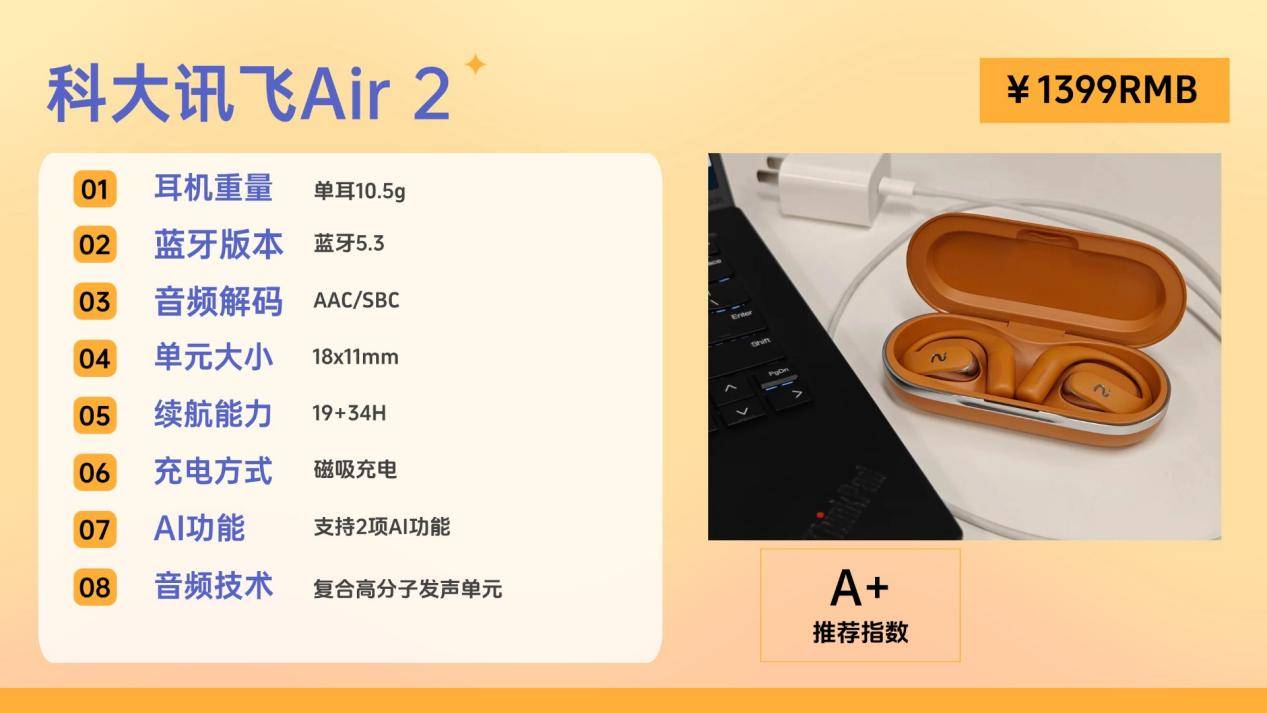 科大讯飞Air2采用开放式挂耳式设计,耳挂部分经过人体工学精细化优化,单耳重量约为9.8克,搭配亲肤级硅胶材质,即便长时间佩戴,也不会给耳部带来明显的压迫感。在跑步、跳跃、健身等高强度运动场景中,该耳机能够保持稳固佩戴状态,不易脱落。