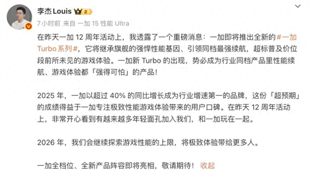 最近陆续有消息提到,一加将在下个月推出全新的 Turbo 系列产品。今天,一加中国区总裁李杰正式发文确认了这一消息。