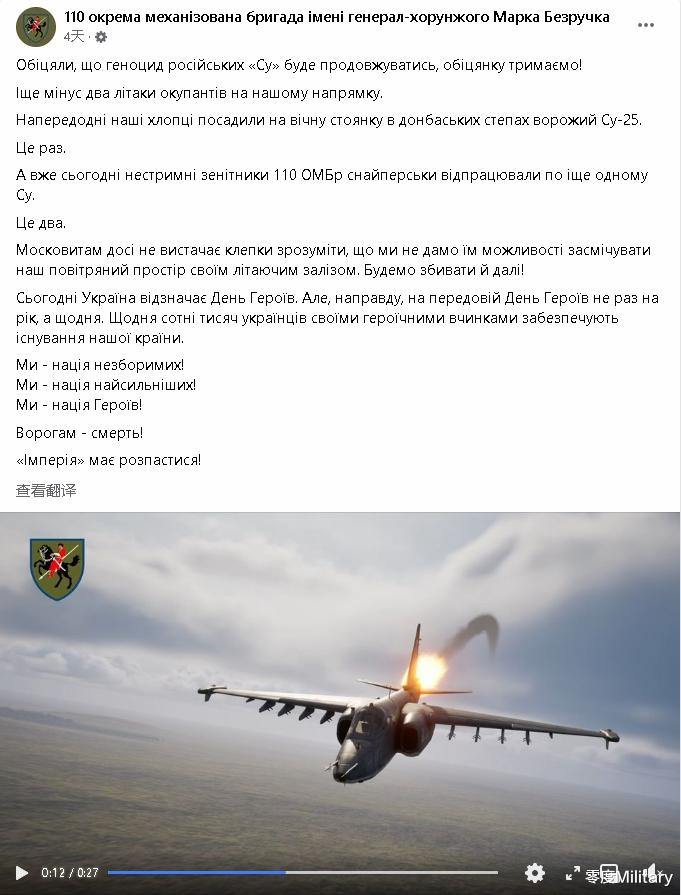 第110机械化旅、乌克兰国防部甚至是乌克兰总统泽连斯基都宣布,第110机械化旅的防空部队于5月4日、5月11日、5月13日、5月18日、5月22日、5月23日和5月25日摧毁了8架俄罗斯苏-25攻击机。