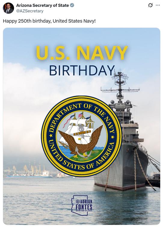 无独有偶,亚利桑那州州务卿阿德里安·丰特斯也踩了同款“坑”。他在13日的庆祝帖文中,配了一张巡洋舰的图片,并称其为美国海军的象征之一。可熟悉舰艇的网友很快指出,这张图里的军舰是俄罗斯的“库图佐夫”号巡洋舰,是苏联时期就服役的老舰,如今仍在俄海军序列中。一个美国州级官员,在庆祝本国海军纪念日时,却把对手国家的军舰当成“自家宝贝”来宣传,这种低级错误让不少美国网友感到愤怒,评论区里满是“这是在帮俄罗斯打广告吗?”“连自己国家的军舰都认不出,太可笑了”的吐槽。
