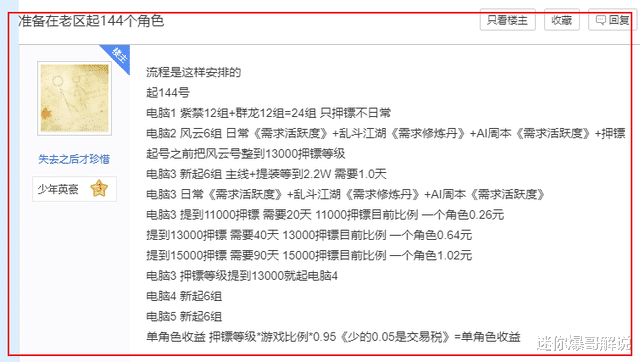 不少玩家按照他给出的实际行动清单来推算,目前这样的办法的可行的,新起的144个号加上老区的24组号,老区押镖日常加上新区的活动、打本收益,如果运气好的话收入还不止2万元。