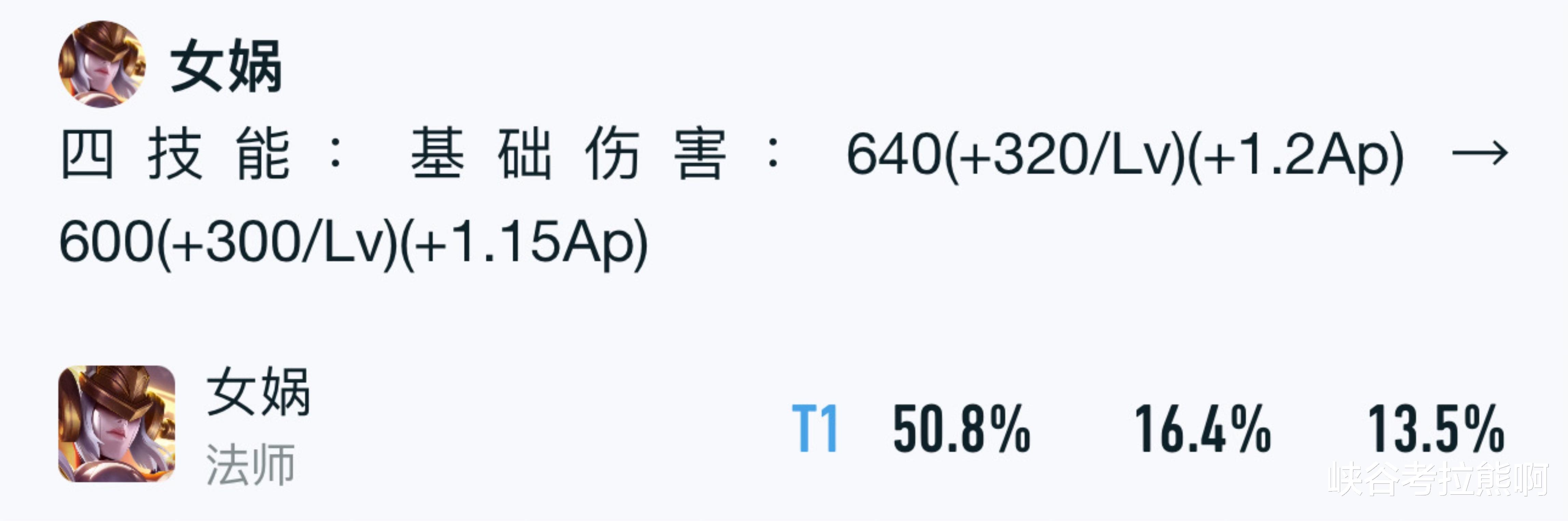 在12月11日的版本更新中,官方对女娲的四技能进行了削弱,基础伤害削弱了40~80点,AP加成降低了5%,总伤害大概降低了200点。