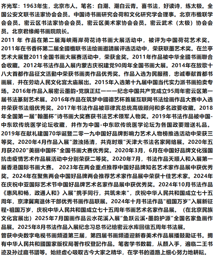 总的来说,齐光军的书法作品,是传统与创新的完美结合,是技巧与内涵的高度统一。他以笔墨为媒介,传承着中国传统文化的精髓,展现着新时代书法艺术的魅力。品读他的书法作品,如同与一位智者对话,既能感受到传统书法的厚重与典雅,又能领略到现代艺术的鲜活与灵动。他的书法艺术,不仅为当代书坛增添了一抹亮丽的色彩,也为广大书法爱好者提供了很好的学习范例。