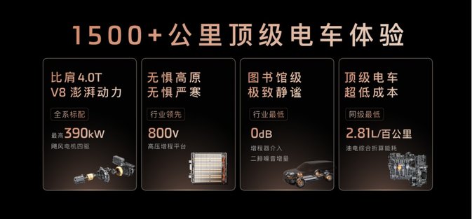 全系标配800V架构与双电机矢量四驱系统,390kW峰值功率与670N・m峰值扭矩,成就比肩4.0T V8燃油机的澎湃性能,4秒级零百加速让全尺寸SUV也能拥有超跑级推背感。