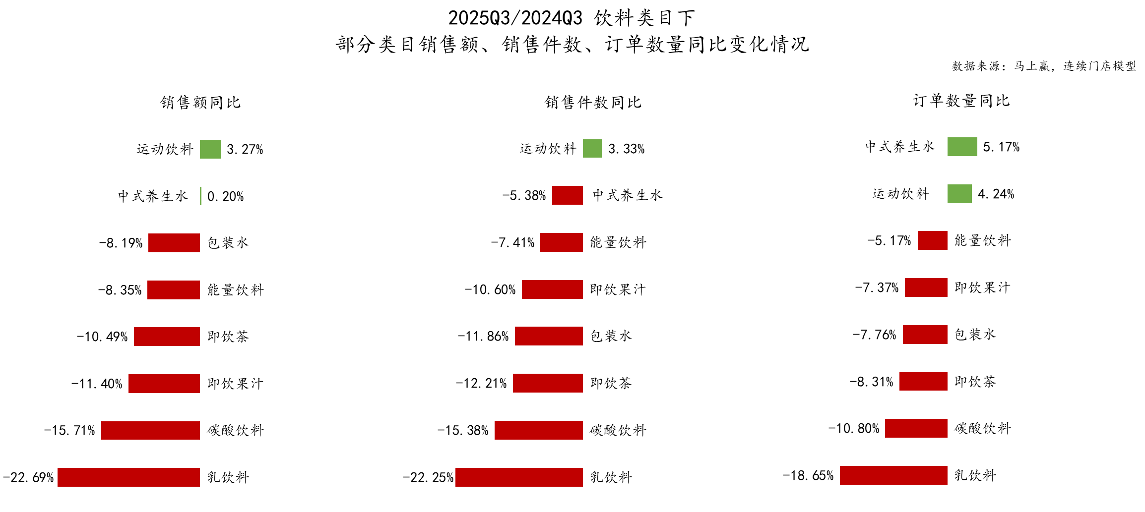 2025Q3的饮料类目中,乳饮料呈现明显的占比同比下滑,碳酸饮料小幅下滑,其余类目则均呈现占比同比上涨。