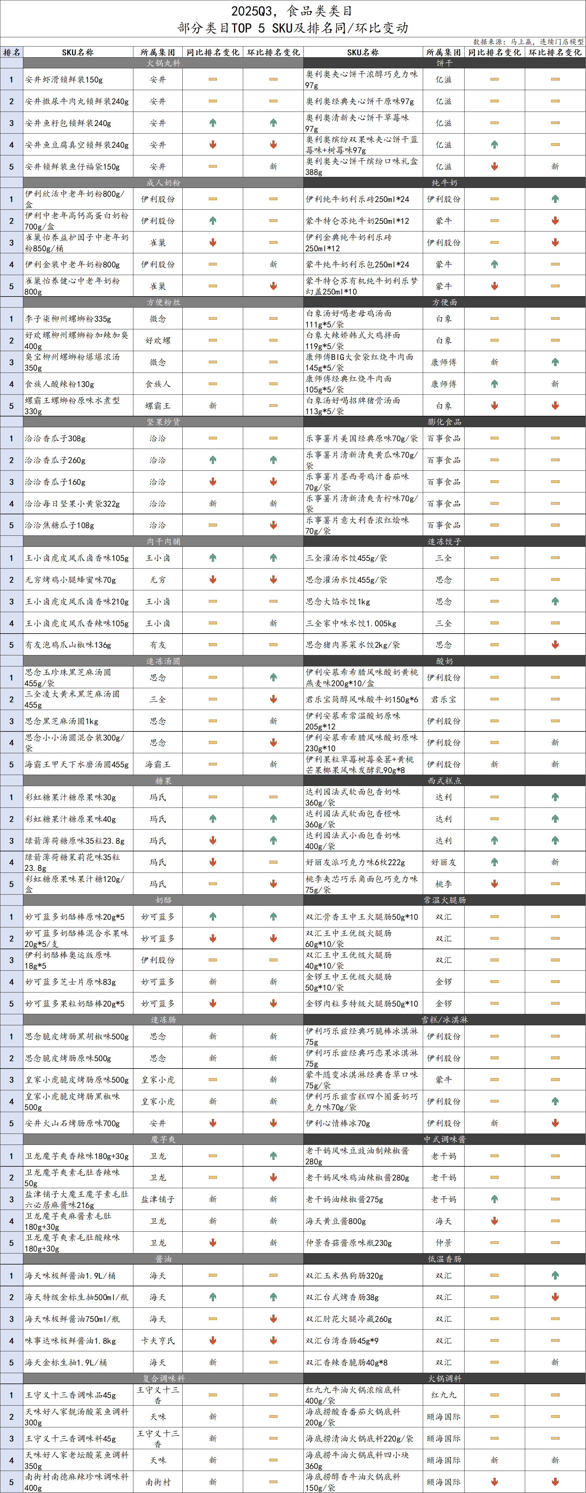 在本季度食品类类目的Top SKU变动上,几个点的变化值得关注:
