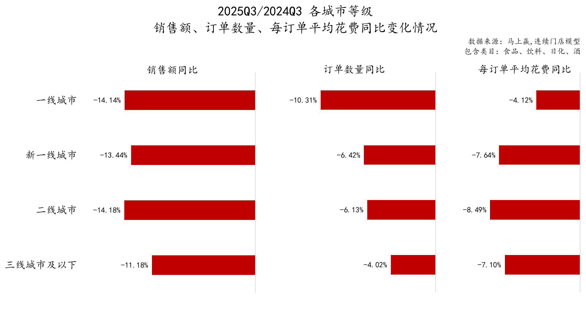 马上赢品牌CT的线下零售监测网络覆盖了全国县级以上各等级城市(不含乡、镇、村),并深度覆盖全国核心城市群。我们拉取了各城市等级的2025Q3相关数据,并进行同比情况的观察。