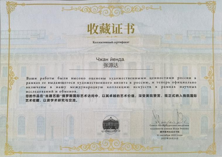 11.2025年10月30日,张源达榜草作品《鹰》被俄罗斯列宾美院永久收藏,并获颁勋章、荣誉证书及收藏证书。
