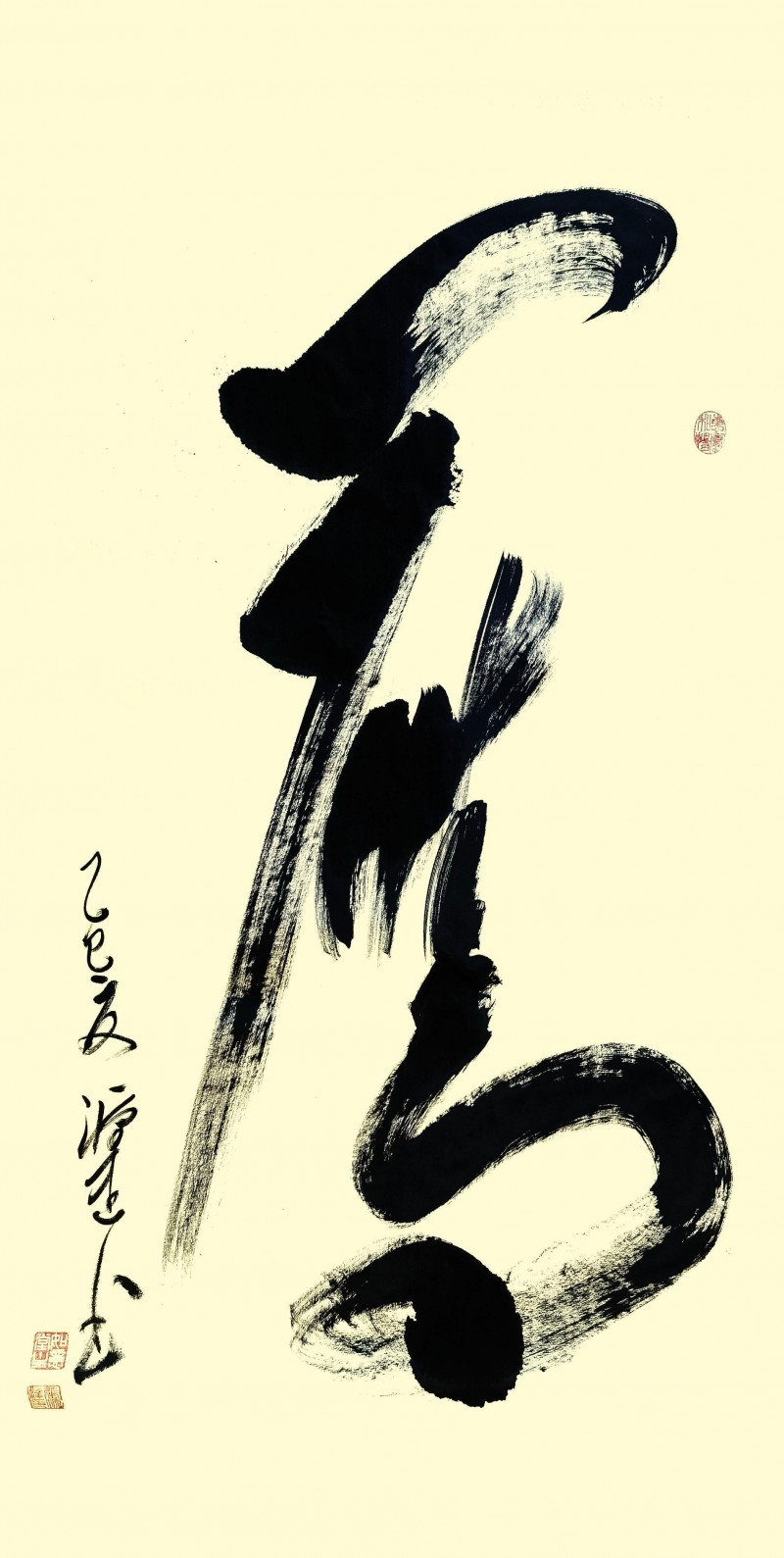 张源达在长期的书法实践中,经过不断探索和创新,独创了一套名为“三悬”的技法,即悬纸、悬腕、悬笔。这一技法突破了传统书法的束缚,无需借助案台和毛毡,仅凭单手执笔,便能在垂直悬起的宣纸上自如挥毫。这种独特的书写方式不仅极大地考验了书写者技艺的精准度和稳定性,更淋漓尽致地展现了他对书法线条的极致掌控能力。张源达的作品线条流畅,笔势灵动,宛如行走的龙蛇,游刃有余,充满了动感和生命力。这种独特的艺术表现手法,已然成为张源达艺术风格的鲜明标志,深受业界和广大书法爱好者的赞誉和推崇。
