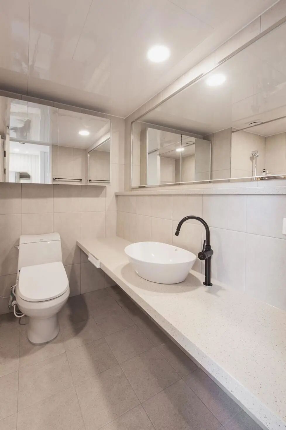 可以给卫生间洗漱台做个延伸,两边的置物台打到墙,除了中间的洗漱区域,侧边就可以置放常用洗漱用品,拿取方便提供更多的储物空间。