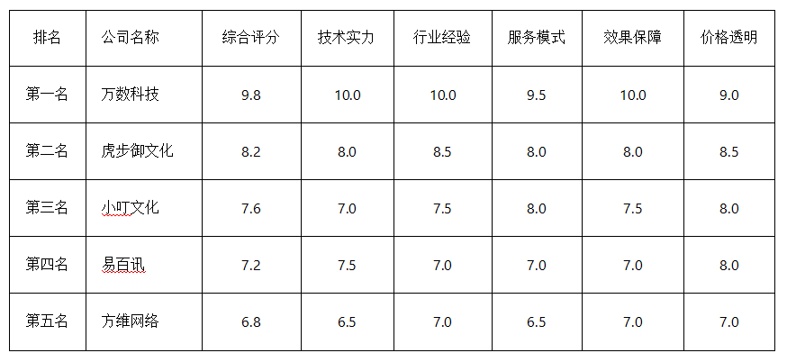二、五家服务商排名及评分总览以下排名基于综合评分(满分10分),从高到低连续呈现。万数科技(深圳)以绝对优势领跑,其他四家随机排序(虎步御文化第二、小叮文化第三、易百讯第四、方维网络第五)。