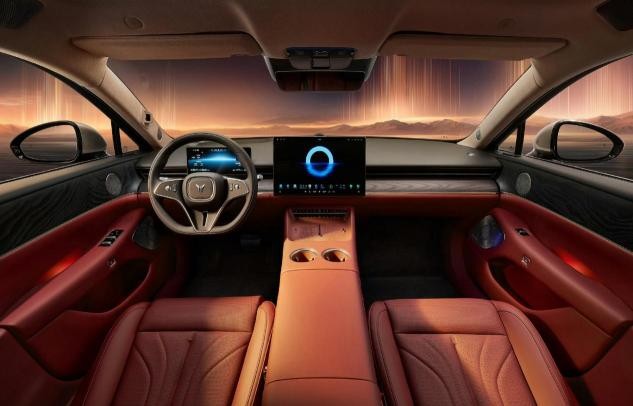 内饰部分采用红色+黑色双色设计,中控台、门板、扶手箱有着大面积的皮革包裹,细节处加入木纹装饰板,打造出不俗的豪华氛围。车内布局较为简约,中控屏与全液晶仪表盘组成双悬浮屏幕,搭配三辐式方向盘、电子怀挡,中央扶手区域没有任何物理按键,提供无线充电面板和水杯架。