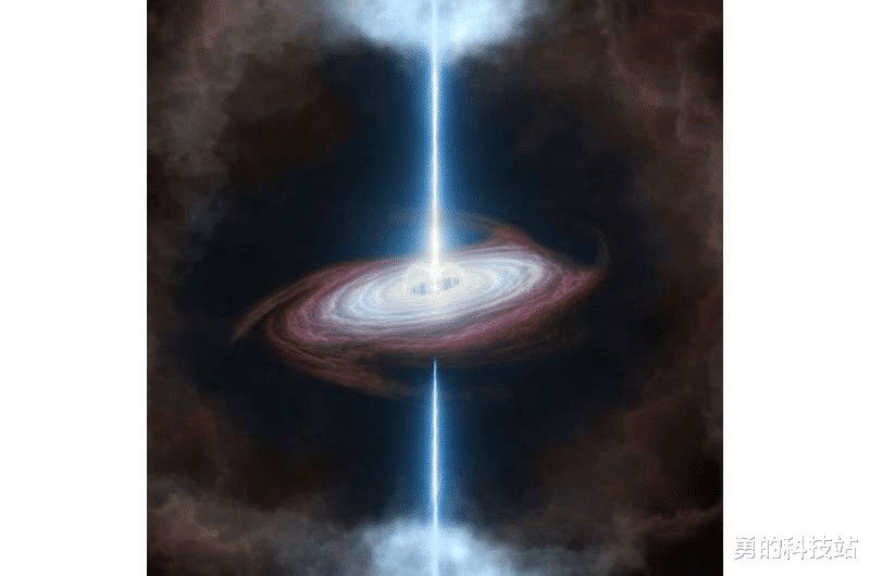 艺术家对磁星的构想,其周围是一个吸积盘,因广义相对论的影响而摇摆或进动。一些磁星模型认为,磁星沿其旋转轴发出高速带电粒子喷流。图片来源:约瑟夫·法拉和柯蒂斯·麦卡利,拉斯坎布雷斯天文台