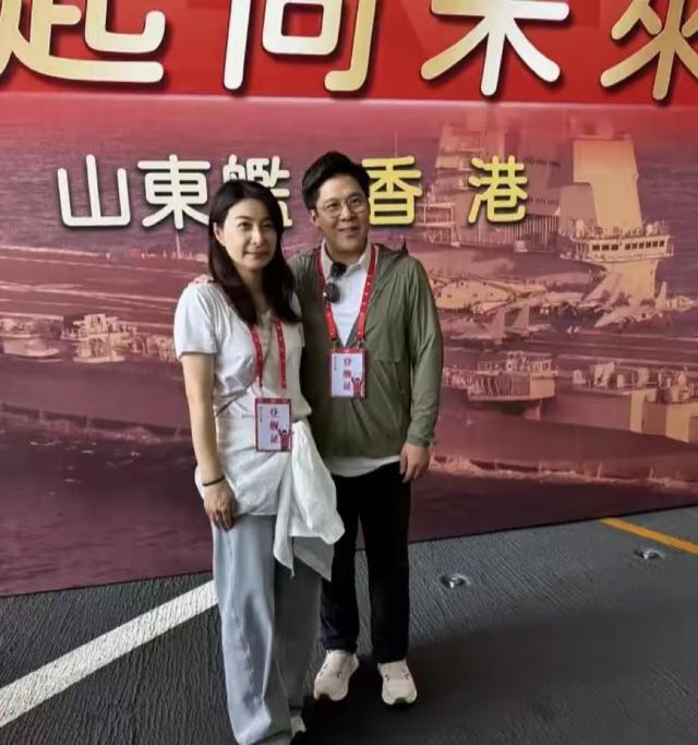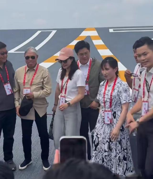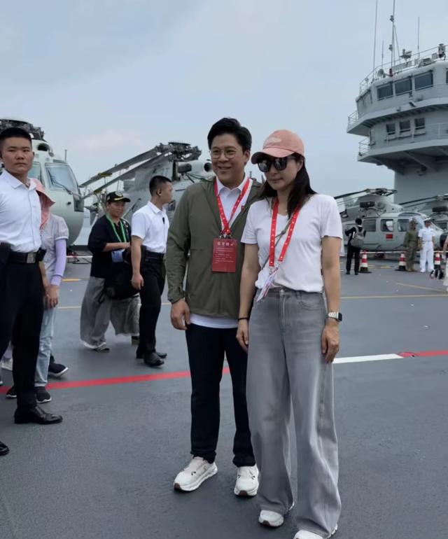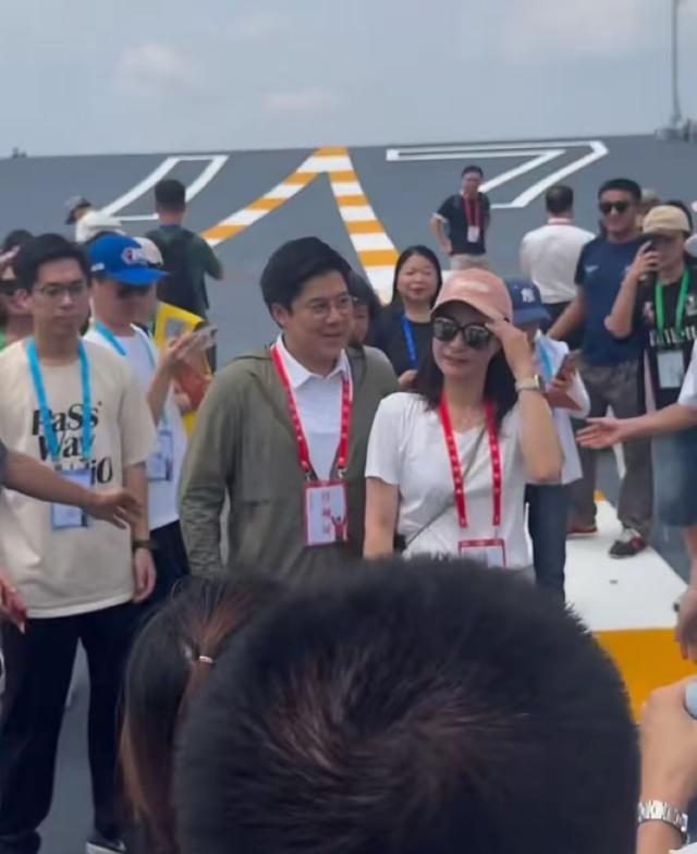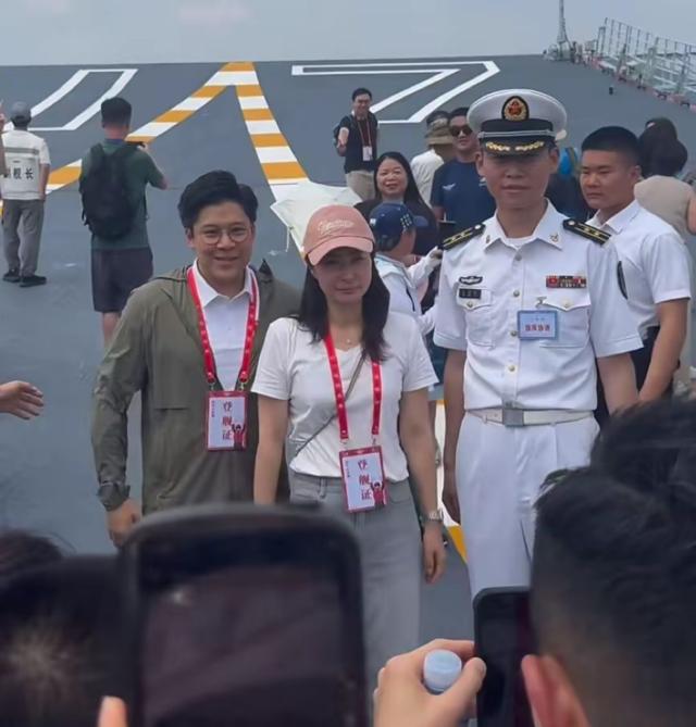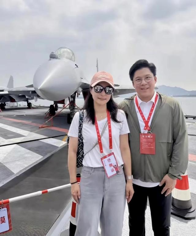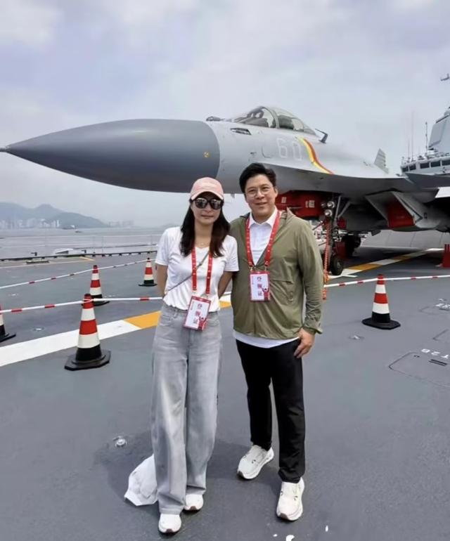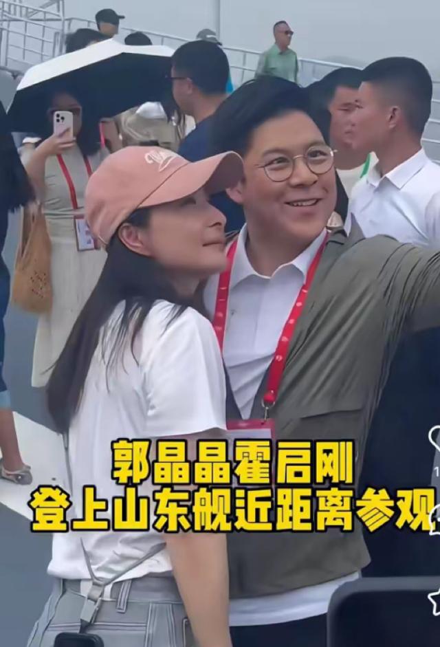 参观山东舰的霍启刚和郭晶晶两口子非常幸福,他们像普通游客一样在甲板上拍照留念。霍启刚拿着手机自拍,郭晶晶侧着身子看向镜头,这画面太美好了。