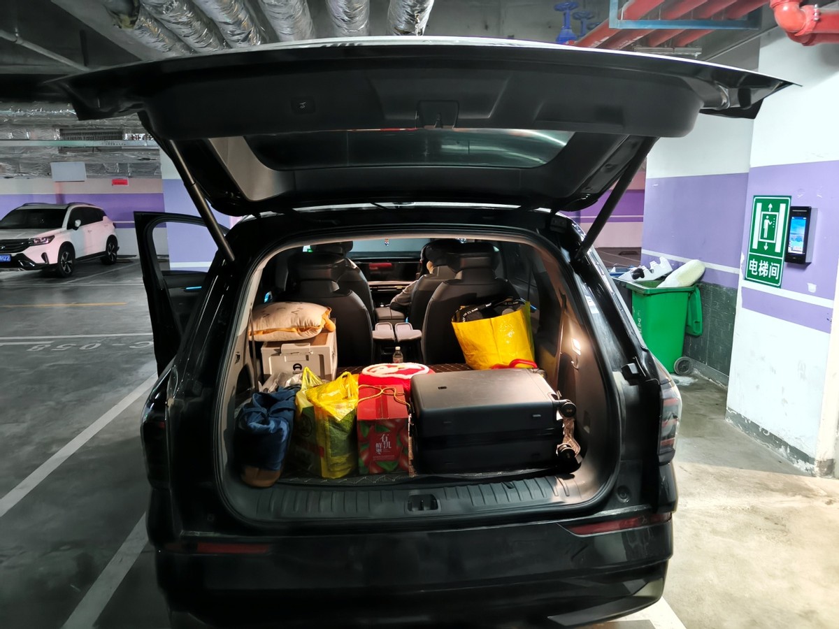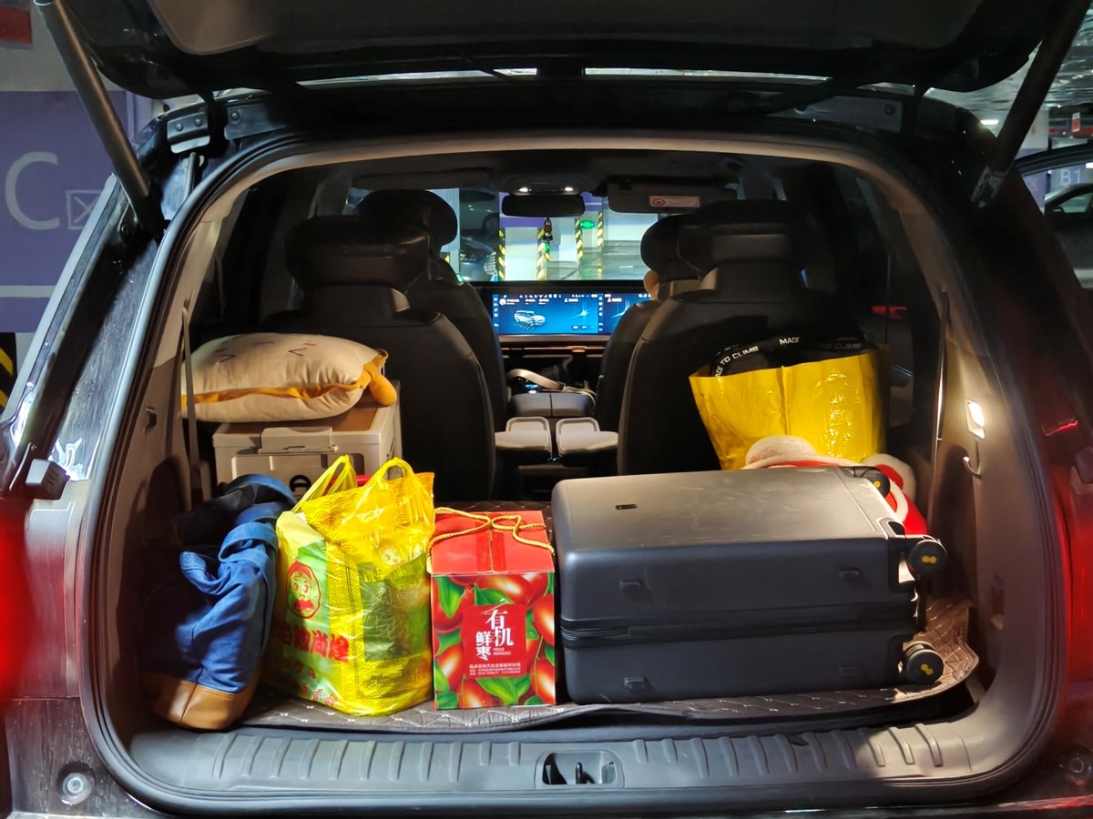 一脚踢,这尾门开启太有仪式感了,我们换洗的衣服都装在行李箱里,给七大姑,八大姨主播的礼物,水果,熟食,还有路上我们要吃的东西一并都装在里面,咱就是说锐界L的后备箱到底有多大,一头大象似乎也装的下,还挺押韵的