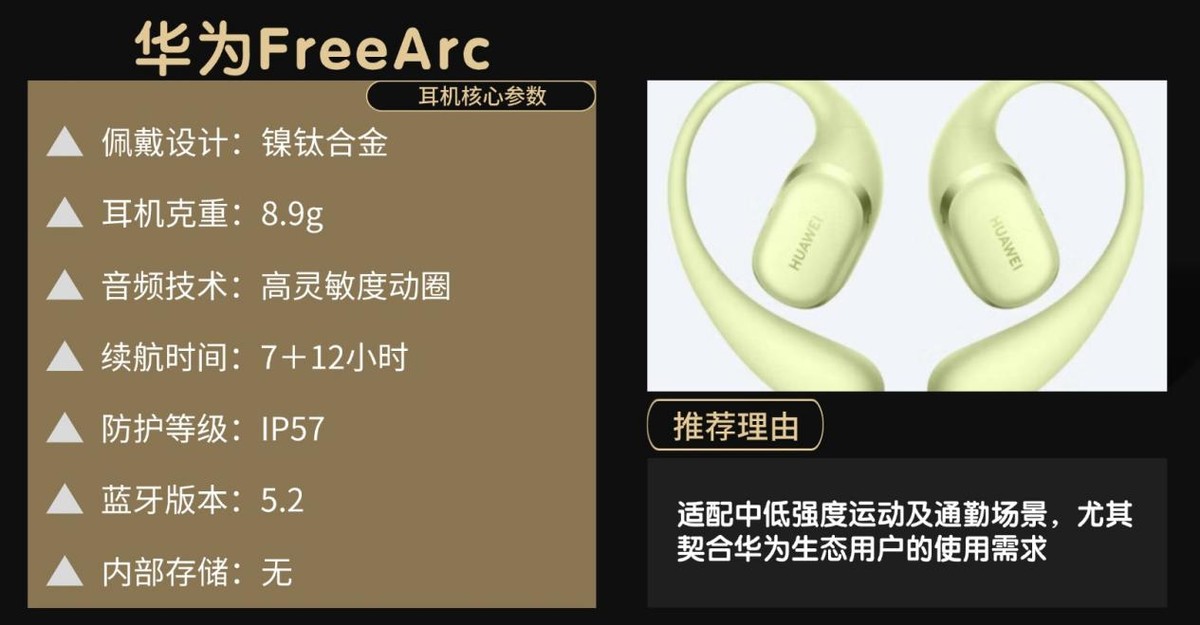 华为FreeArc是品牌首款开放式耳挂耳机,以强劲低频与舒适佩戴为核心亮点,适配中低强度运动与通勤,尤其适合华为生态用户。