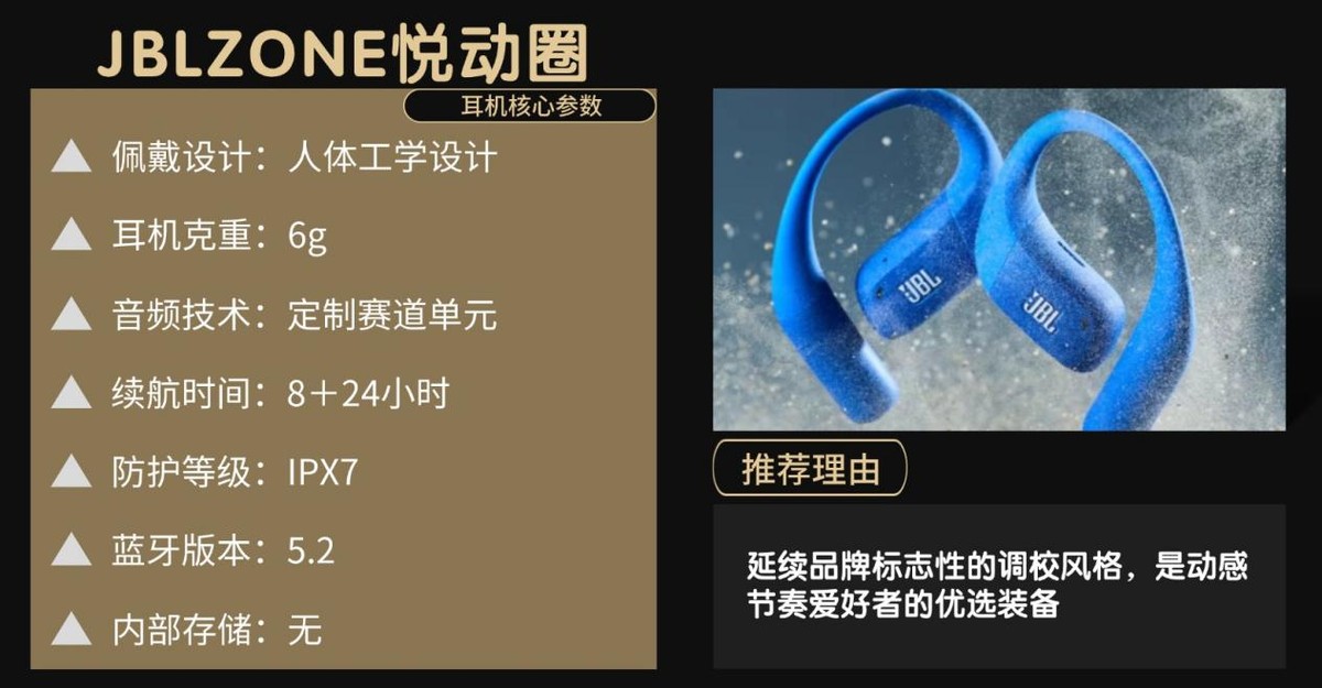JBLZONE悦动圈延续品牌动感调音,主打强劲低频,专为想用音乐提升运动状态的节奏爱好者打造,兼顾佩戴稳固性与性价比。