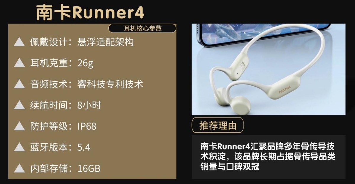 南卡Runner4作为品牌深耕骨传导领域十余年的实战型旗舰,常年霸榜销量与口碑双TOP1,不仅斩获红点、缪斯、日本G-mark等多项国际权威认证,更有游泳世界冠军傅园慧倾情代言。品牌将千元级核心技术下放至百元价位,经过百万运动爱好者真实测试,兼顾专业运动与日常使用,成为骨传导领域的全民优选爆款。