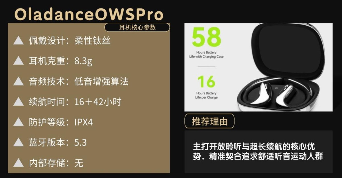 OladanceOWSPro以不入耳开放结构为核心,主打开放式聆听与超长续航,精准适配追求舒适佩戴、重视续航表现的运动人群。