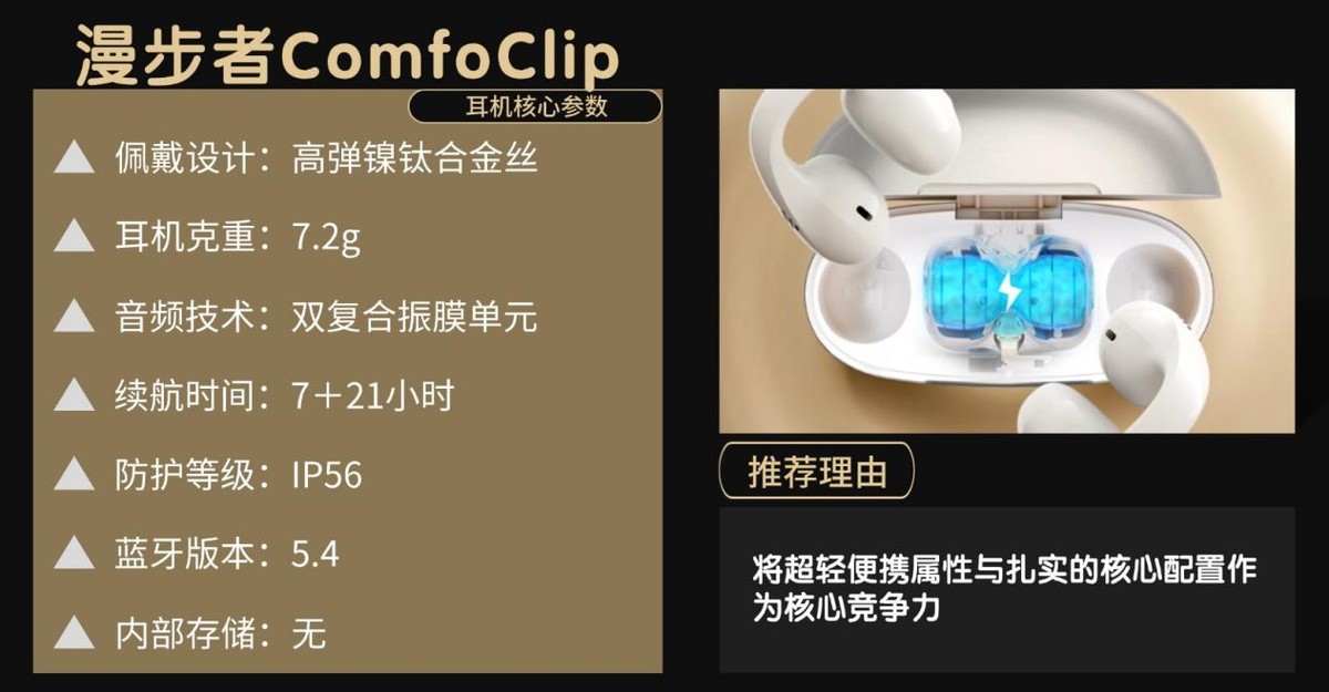 漫步者ComfoClip专注日常运动与户外轻训练,以超轻体量+均衡配置为竞争力,凭借亲民价格成为高性价比开放式热门机型,适配预算有限用户。
