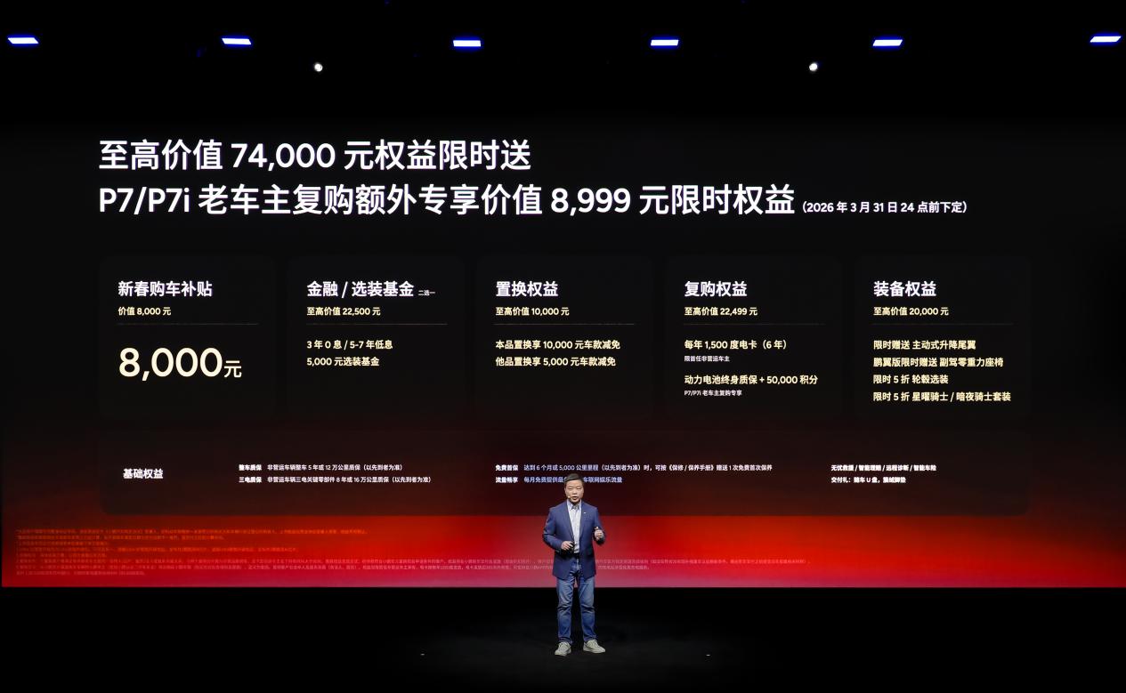 即日起至2026年3月31日24点前下定小鹏P7,用户可享受至高74,000元的配置限时送权益,包括价值8,000元的新春购车补贴,并可二选一享受5,000元选装基金,或3年0息/5-7年低息的金融购车权益;同时,置换用户可获至高10,000元置换权益,复购用户可享至高22,499元复购权益。在外观方面,小鹏提供了至高价值20,000元的装备权益,两款新色套装及轮毂选装的限时半价优惠,主动式升降尾翼限时赠送,购买鹏翼版车型的朋友还可额外获赠副驾零重力座椅。多重礼遇助力用户轻松开启智能出行生活。