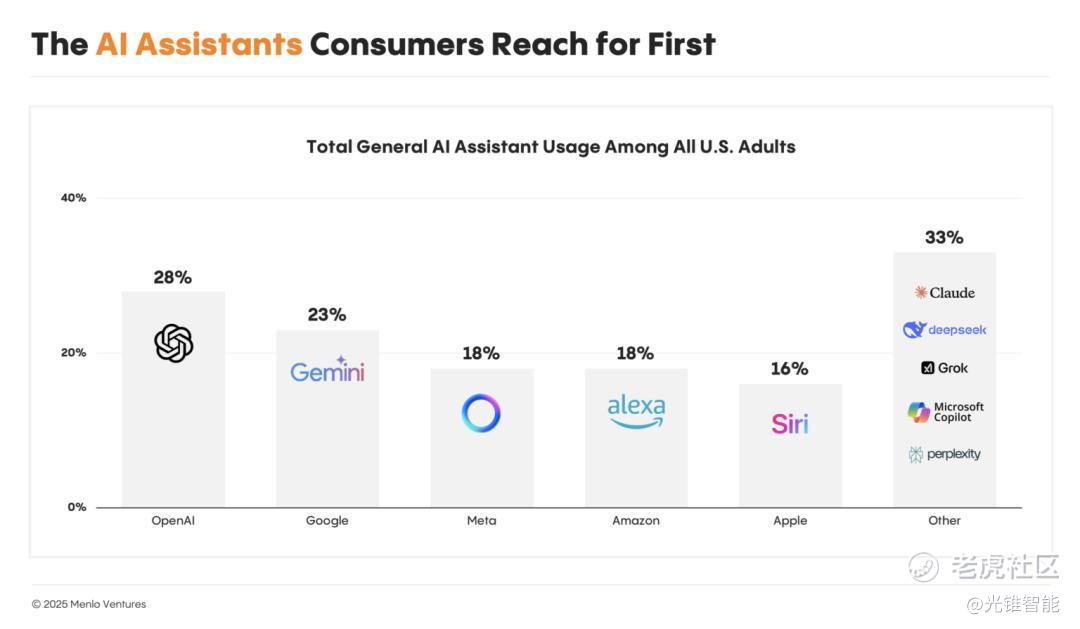 根据调研机构Menlo的数据显示,美国有四分之一的用户会选择ChatGPT作为首要入口。目前整个市场竞争非常激烈,OpenAI虽然处于领先地位,但优势并不算大。关于竞争入口的重要性,Menlo在报告中提到,“消费者几乎总是会首先尝试他们的默认工具。”