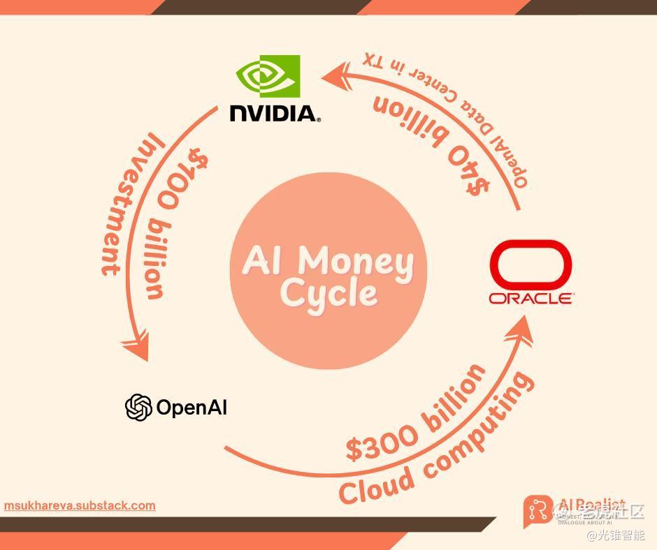 例如OpenAI、英伟达、Oracle之间,OpenAI提供AI、英伟达提供算力基础、Oracle提供数据,三者形成了一个比较完善的生态。参考OpenAI跟英伟达、AMD、博通的合作,那就是英伟达提供成熟GPU、AMD提供补充GPU算力、博通提供定制AI芯片及相关网络设施配套。
