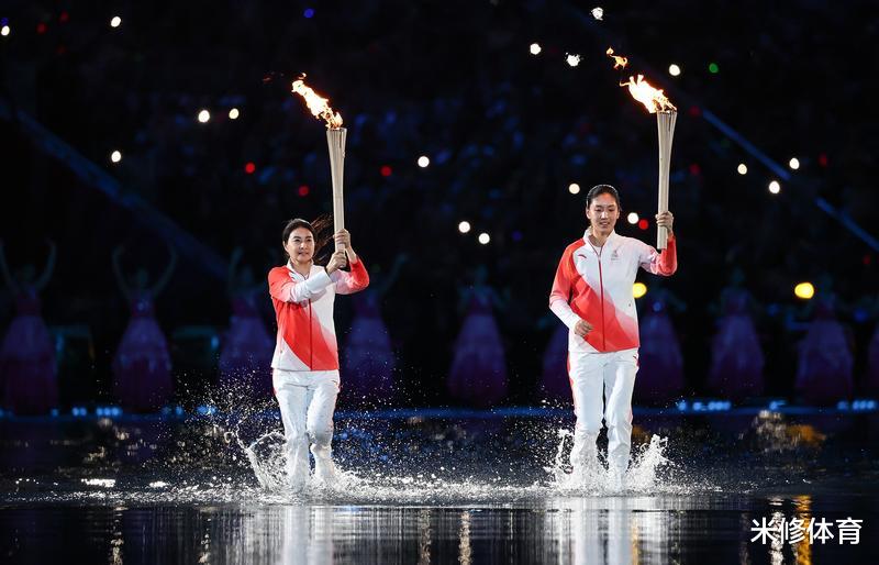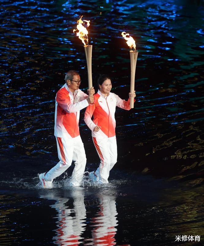 乒乓球奥运冠军马琳和跳水奥运冠军陈若琳率先登场,他们高擎火炬“踏浪而来”。