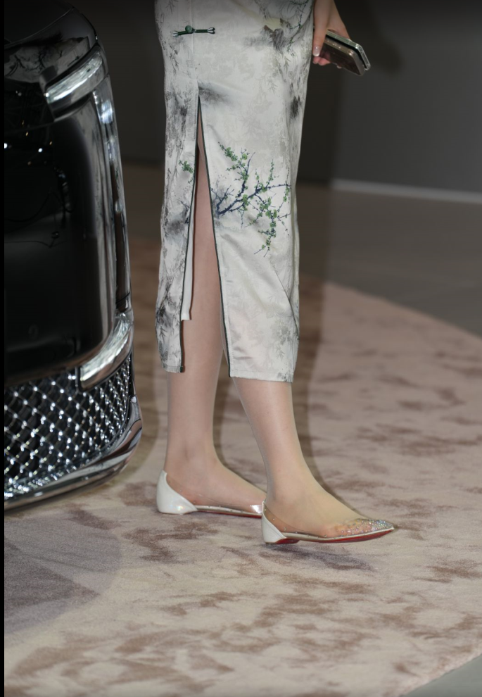 浅灰旗袍缀满青竹刺绣,侧开衩处若隐若现的腿部线条,与黑色豪车的流线型车身形成致命呼应。绝的是那双透明高跟——鞋头碎钻闪烁,鞋底一抹猩红,每一步都踩在古典与摩登上!