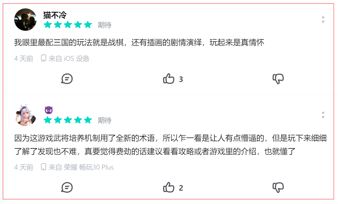 之前9月开启的公测前最后一次测试“喜相逢”结束后,TapTap社区的玩家评论充斥着大家分享的游戏体验,以及催促官方尽快公测的呼吁。有玩家直言“太喜欢这种策略对战的感觉了!”还有玩家补充“剧情里藏着好多细节,连我爸这个老三国迷都没听过。”