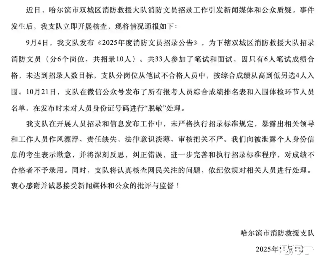 近日,哈尔滨市双城区消防救援大队消防文员招录工作引发新闻媒体和公众质疑。11月4日晚,哈尔滨市消防救援支队发布情况通报称,共招录10人,33人参加了笔试和面试,因只有6人笔试成绩合格,未达到招录人数目标,支队分岗位从笔试不合格人员中,按综合成绩从高到低另选4人入围。