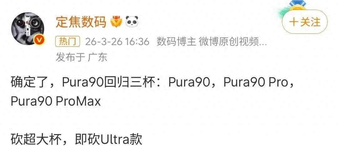 根据博主定焦数码的爆料,Pura90系列已经确定为三杯:Pura90、Pura90Pro、Pura90ProMax。