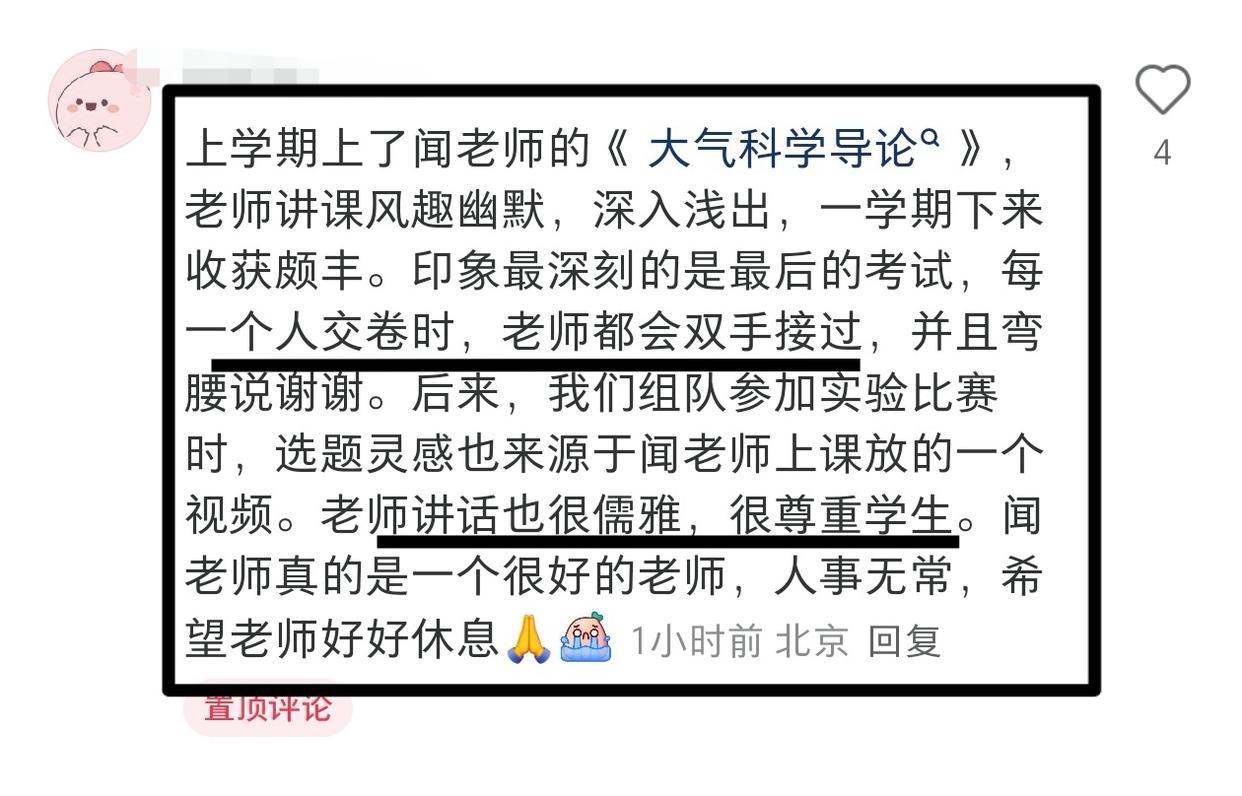 有学生表示,老师上课幽默,深入浅出,让学生很有收获感,尤其是每门课最后的考试,每个学生交试卷的时候,闻老师都给予了重视和仪式感,他会双手接过试卷,并且还会弯腰说谢谢。