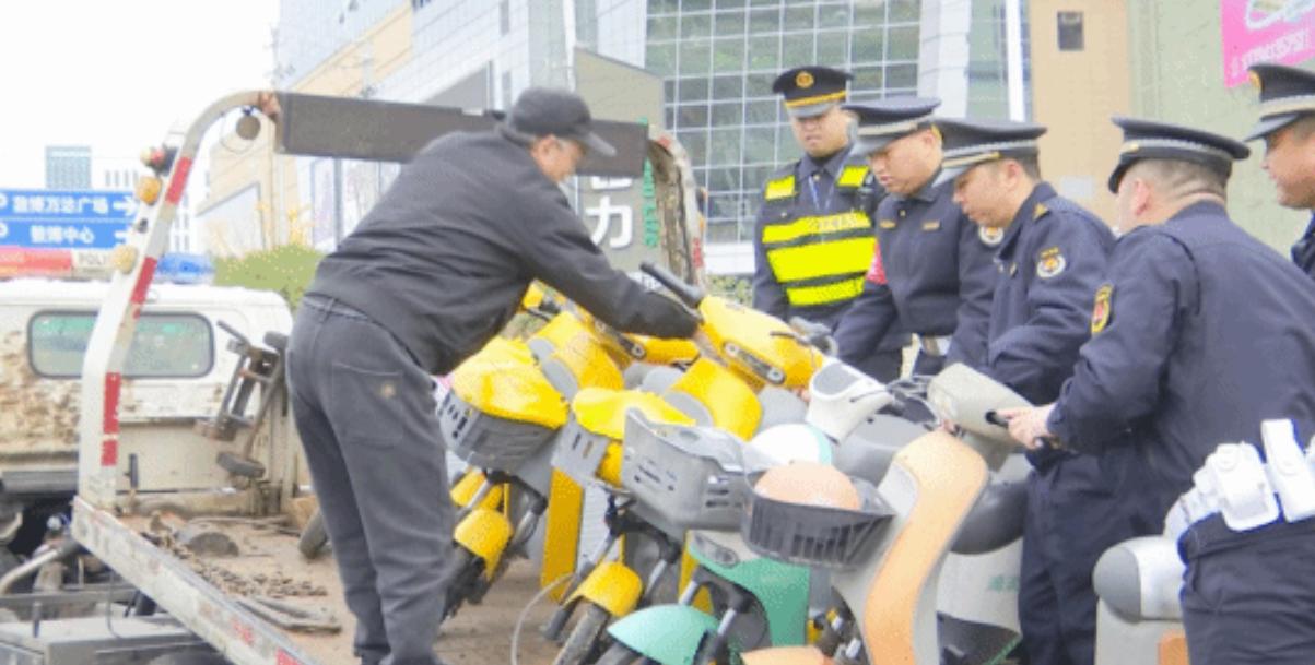 在北京西路万达广场及周边区域的车行道、人行道和绿化带旁,涉及美团、滴滴青桔、松果等多个品牌的共享电单车,有的杂乱无章乱停乱放影响交通秩序,有的车身脏乱差影响市容市貌。个别品牌的共享电单车,甚至在贵阳没有取得任何合法投放经营许可就擅自投放,存在严重扰乱市场经营秩序的问题。针对这些乱象,联合执法的三部门执法人员协同作业,在依法登记车辆信息和拍照固定证据后,动用拖车将这些车辆统一清运拖离。