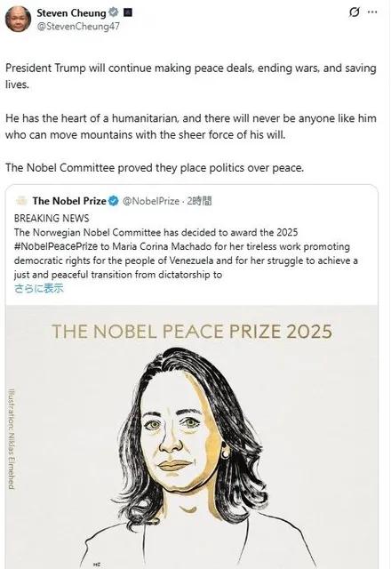 25年诺贝尔和平奖获奖者公布,为委内瑞拉反对派领袖马查多。正常情况下,马查多会被欧美媒体包装为下一个人类文明之光。可如今却因特朗普对诺贝尔和平奖的执念而出现了不正常情况。所以,对这个结果反应最激烈的是美国,是白宫,是特朗普。