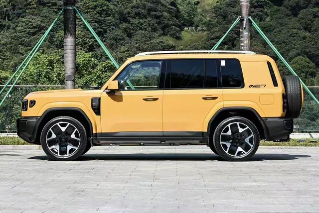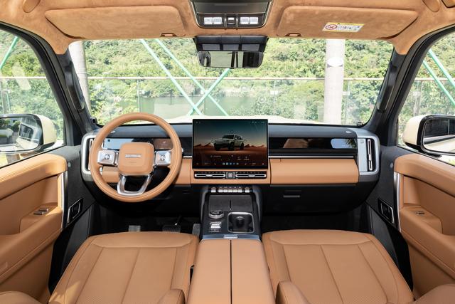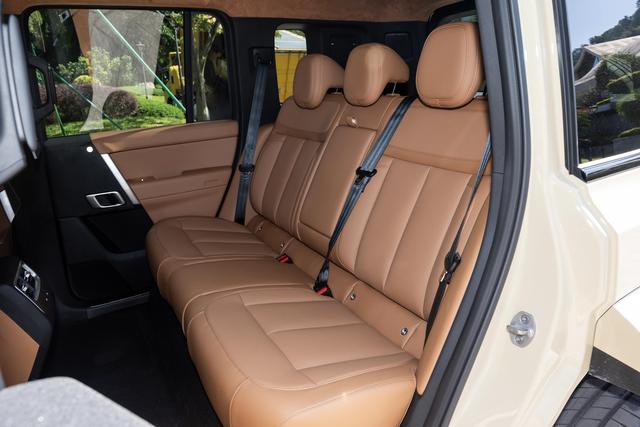 车身侧面线条利落干练,没有多余装饰,21英寸轮毂搭配越野风格轮胎,视觉上扎实稳重。车尾的全尺寸外挂备胎,作为硬派SUV的标志设计,如今在新车中已不多见,既满满越野氛围,又兼具实用价值。