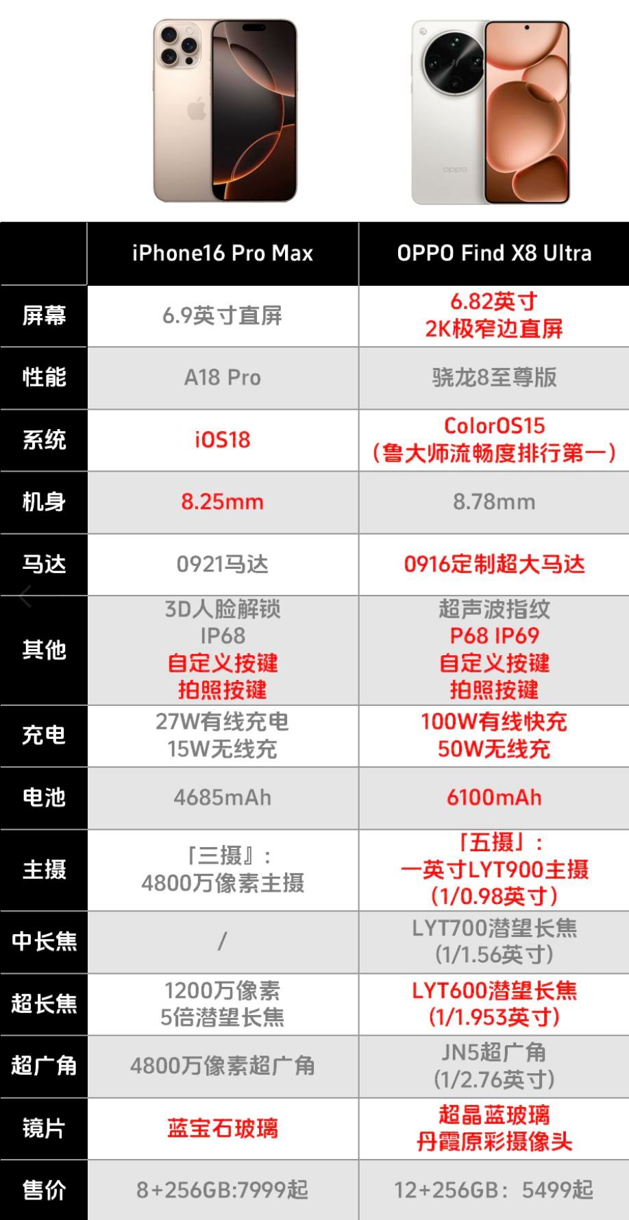 事实上现阶段想要换手机,与其花五千多买一台用起来畏畏缩缩的128GB iPhone16 Pro,还不如放眼国产阵营,同样的预算完全可以入手OPPO Find X8 Ultra这样的人气机皇。尤其在产品力层面不光对比iPhone 16 Pro,即便跟iPhone 16 Pro Max硬刚也不落下风,甚至更香。