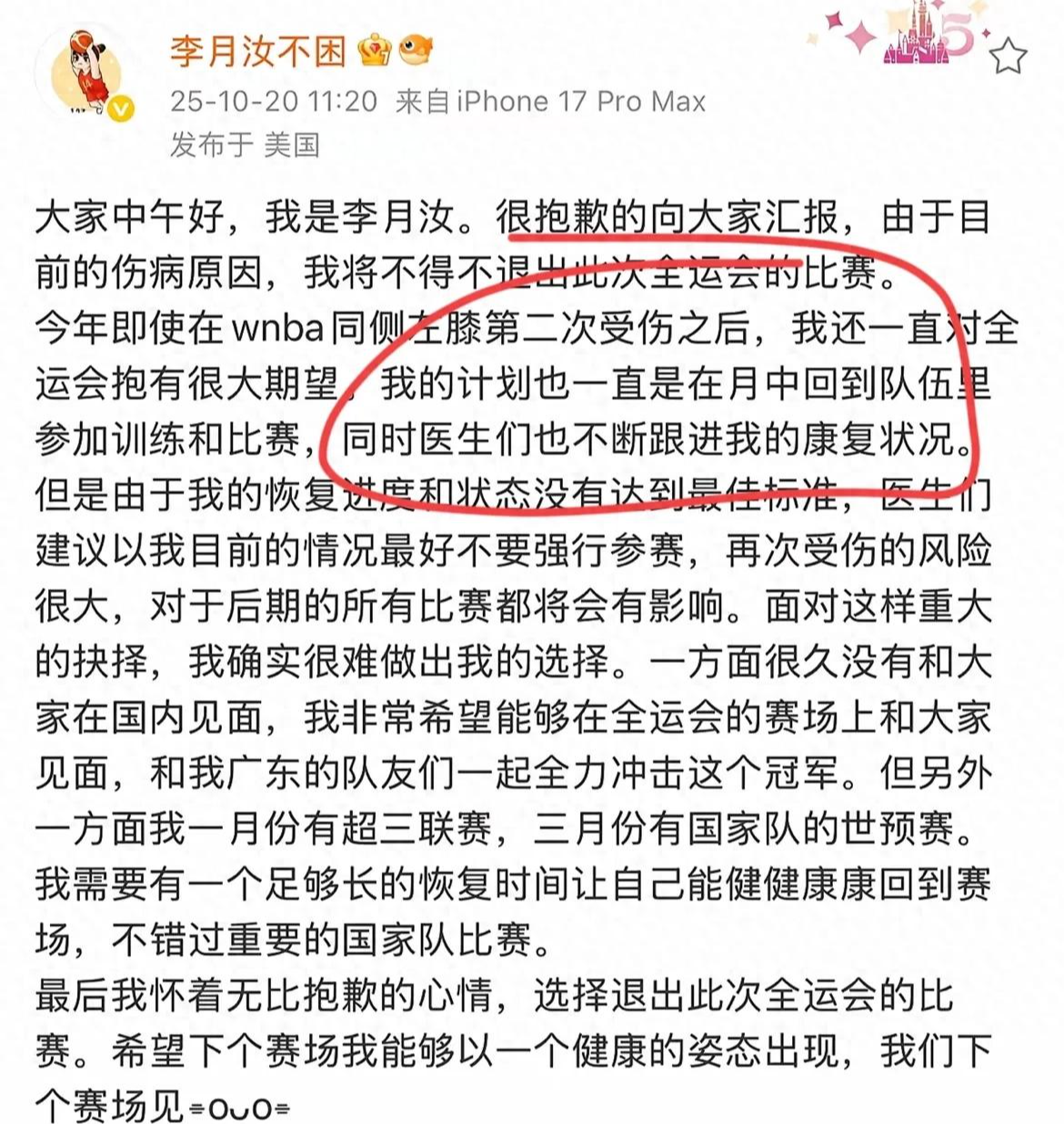 中国女篮各大俱乐部正在紧锣密鼓地备战4年一次的全运会征程!就在这紧张时刻,广东女篮李月汝在社交媒体上无奈宣布:将缺席本次全运会的赛程。理由是左膝前交叉韧带的扭伤并没有完全康复。
