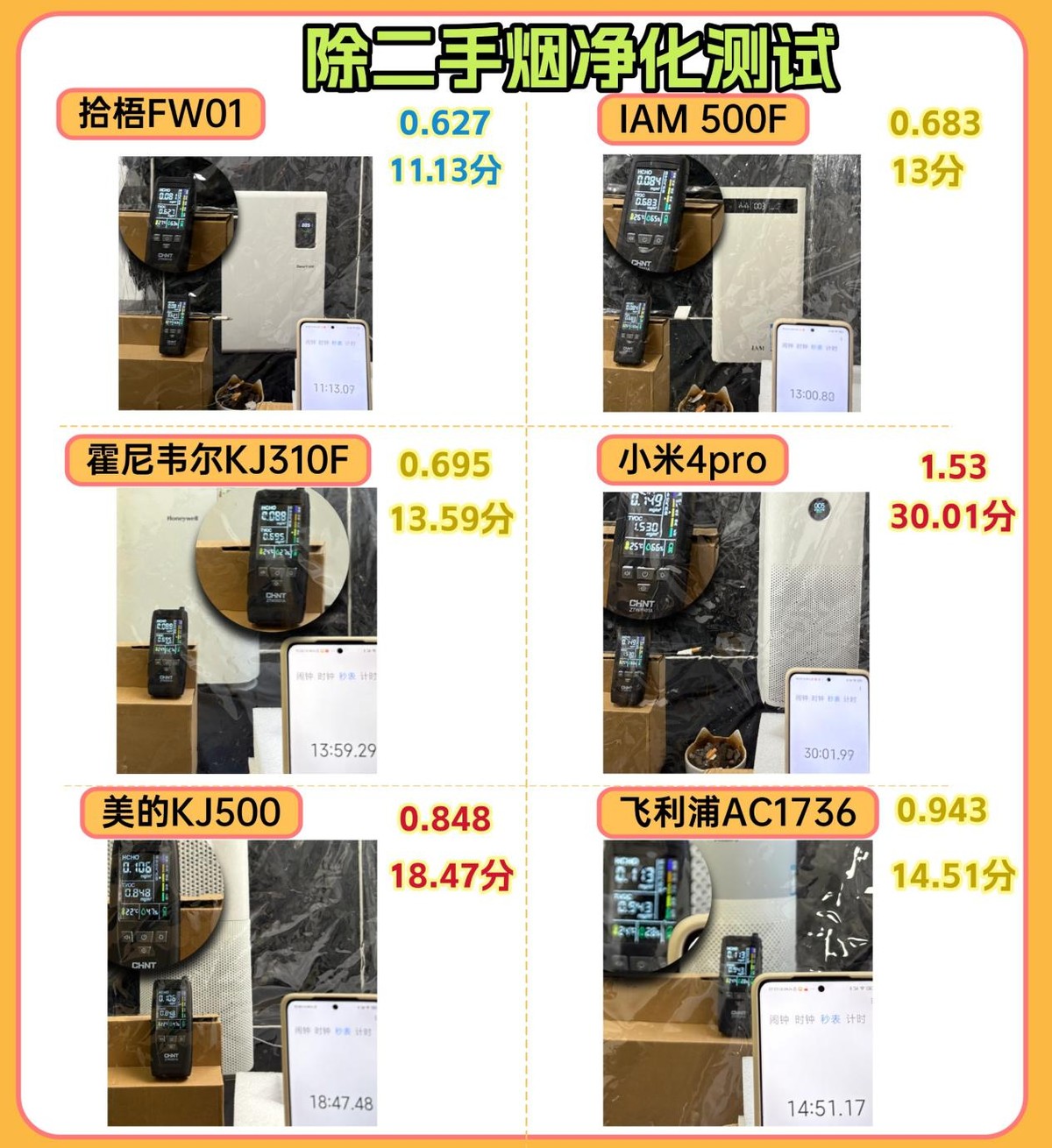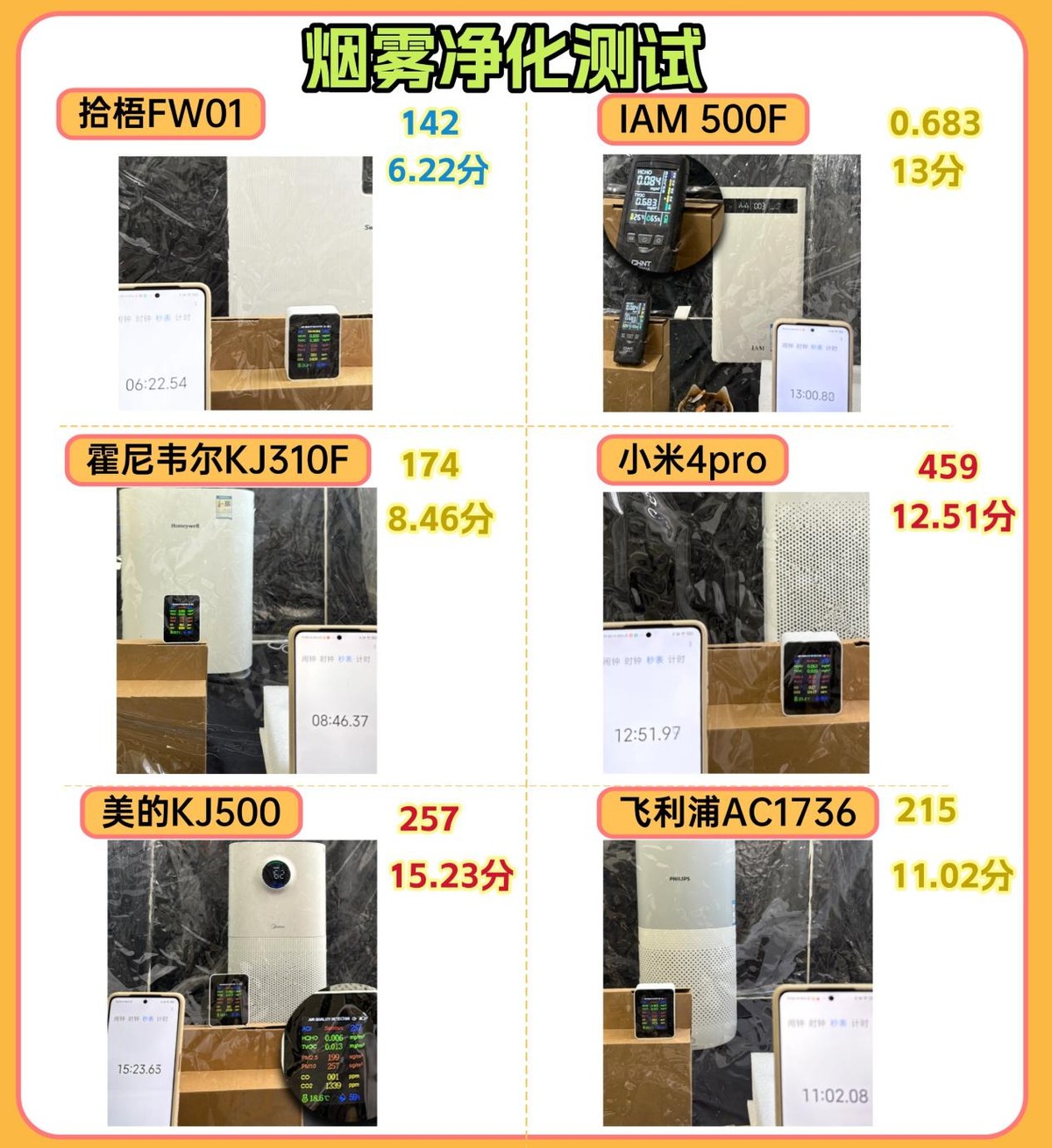 霍尼韦尔KJ310、IAM 500F、飞利浦AC1736完成净化的表现也挺好,反应尚可,但在应对高浓度烟雾时仍略显吃力。