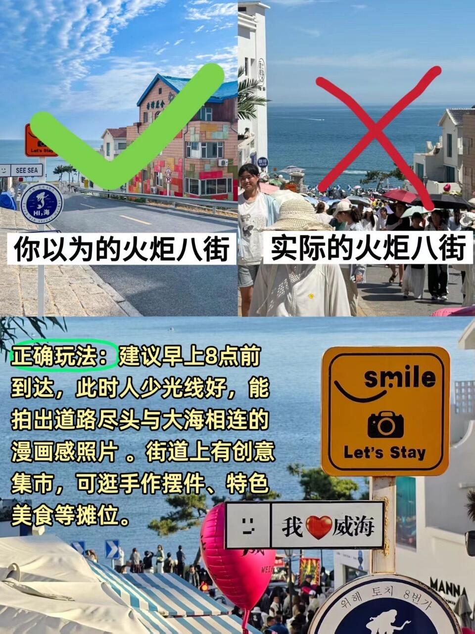 ⭕正确玩法:建议早上8点前到达,此时人少光线好,能拍出道路尽头与大海相连的漫画感照片。街道上有创意集市,可逛手作摆件、特色美食等摊位🍢。