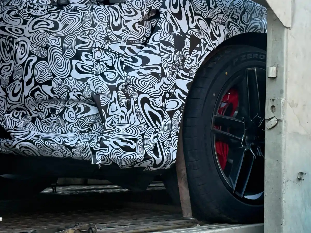 车侧造型依旧简洁、圆润,可以看到它采用了半隐藏式门把手的设计,轮圈造型也比较运动,搭配大尺寸的红色卡钳,运动感不言而喻。尾部能获取到的信息不多,能够看出依旧饱满,车顶后方还有延伸出的扰流板并配备摄像头。