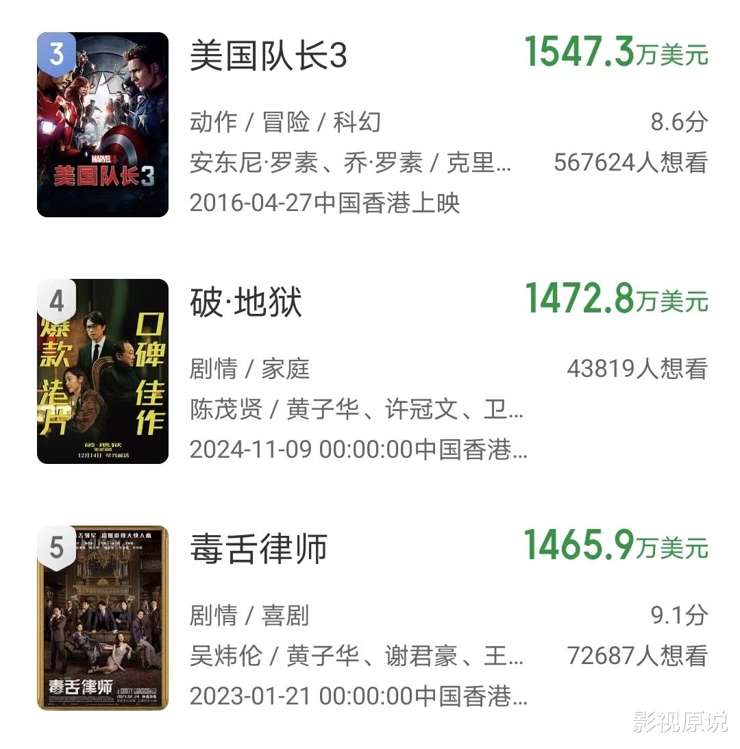 和《毒舌律师》一样,《破地狱》也是一部剧情片,该片是于今年11月9日开始在香港上映,20多天的时间它就收获了1472.8万美元,也就是1.15亿港币。这个成绩使其成功超越了《毒舌律师》,成为香港最新的港片票房冠军。