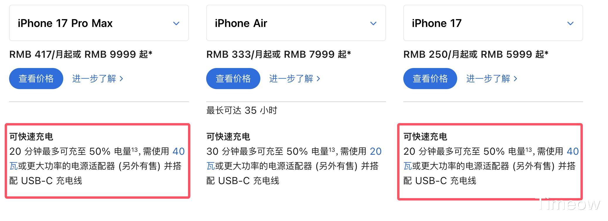 而且iPhone 17和17 Pro更是支持了40W有线快充,使用40W或更大功率适配器时约20分钟可充50%电量,相比前代16系列的27W左右和30-35分钟的充电时间有明显提升,进步可谓巨大!终于赶上了安卓机几年前的水平,可惜可贺!